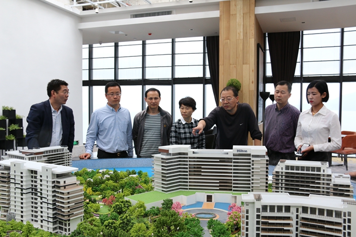 范陽董事長一行不顧旅途勞頓,首先來到項目辦公生活基地與員工親切交談,并參觀了員工宿舍;隨后又興致勃勃地前往山頂體驗中心和銷售展示中心進行考察。黃山秀湖山莊有限公司總經(jīng)理虞小伍、常務副總李克常向國貿集團領導匯報了“安糧黃山太平湖國際旅游度假區(qū)項目”的整體規(guī)劃、建設進展及內部銷售情況。