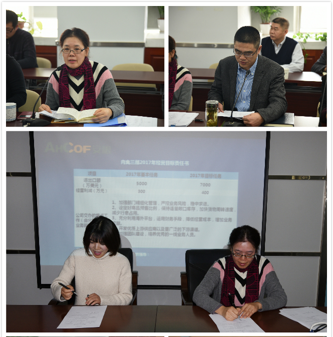 會上,相關(guān)業(yè)務(wù)部經(jīng)理及各子公司負(fù)責(zé)人做了匯報和交流發(fā)言。為了使各業(yè)務(wù)部和子公司更好的完成年度目標(biāo)任務(wù),清晰目標(biāo)任務(wù)的各項要求,會議安排了簡約的簽約儀式,全體業(yè)務(wù)部經(jīng)理及子公司負(fù)責(zé)人與公司鄭重的簽訂了2017年經(jīng)營目標(biāo)任務(wù)書。