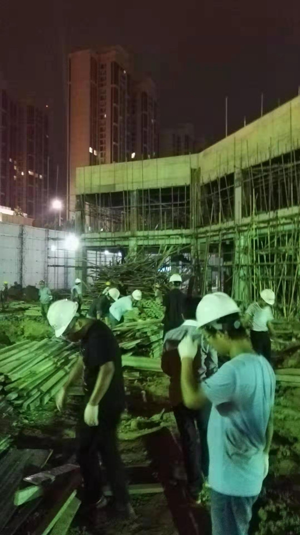 經(jīng)過簡短的會議部署,項目部管理人員即刻動員組織農(nóng)民工加班,楊勇親自和工人們面對面溝通,對工人們曉之以理動之以情。不到11點半,工地現(xiàn)場的工作燈通通亮了起來,鋼筋班組、木工班組、管理人員紛紛投入工作,形成了一組初秋深夜的奏鳴曲。所有管理人員也都在現(xiàn)場陪著工人們一起干,不完成任務(wù)誰都不休息。