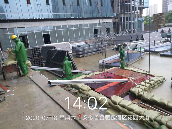 針對入梅以來嚴峻的防汛形勢,已交付及在運營項目積極協(xié)調物業(yè)公司,共同迎戰(zhàn)強降水天氣。位于合作化路和南二環(huán)交口的安糧國貿中心是此次防汛形勢較嚴峻的重點項目,特別是降雨量突破合肥市歷史極值的7月18至19日,積水內澇直接影響到地下室的安全。險情出現(xiàn)時,一線人員及時匯報,各崗位人員在半個小時內到崗參與排險工作。項目部對地庫出入口等易形成倒灌水的危險區(qū)域安排工作人員堆砌沙袋,打開集水井蓋板,保證積水最大流量的排放。同時配合唯品會工作人員啟動區(qū)域排水泵,對易積水難排水區(qū)域進行再清理再疏通,隨著南二環(huán)和合作化路積水水位逐漸下降,安糧國貿中心順利通過了此次防汛考驗。