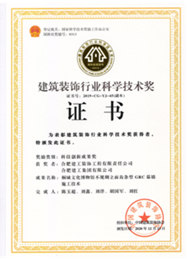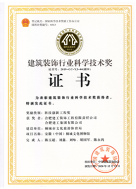 自2019年評選以來,公司申報的“安徽(中國)桐城文化博物館”項目斬獲科技創(chuàng)新工程獎一項,總結(jié)形成的施工技術(shù)成果“不規(guī)則立面齒條型GRC幕墻施工技術(shù)”獲得科技創(chuàng)新成果獎一項,走在安徽省內(nèi)裝飾行業(yè)的前沿。之后相繼獲得兩項科技創(chuàng)新工程獎:合肥市第六十八中學(xué)改擴建項目-綜合樓工程,六安市兒童醫(yī)院、金安區(qū)婦幼保健院醫(yī)療病房綜合樓裝飾裝修工程;兩項科技創(chuàng)新成果獎:“一種可開啟180度的裝飾消火栓暗門”,“ 基于3D建模技術(shù)高支模結(jié)構(gòu)與裝飾結(jié)構(gòu)共用盤扣腳手架安裝技術(shù)”。其中“一種可開啟180度的裝飾消火栓暗門”科技創(chuàng)新成果更是獲得一等獎的好成績。