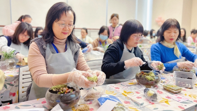 微景觀是將苔蘚、多肉等植物配以砂石、泥土、玩偶裝進(jìn)容器,構(gòu)成妙趣橫生的微觀世界,一個(gè)微景觀本質(zhì)上也是一個(gè)小型生態(tài)系統(tǒng)。女職工們在老師的指導(dǎo)下開始微景觀DIY活動(dòng),大家認(rèn)真構(gòu)思造型,充分發(fā)揮創(chuàng)造力,不一會(huì)兒,一份份清新雅致的微景觀作品便呈現(xiàn)在大家面前。在家中、辦公室的案頭擺上一盆,勞累疲乏時(shí)抬頭瞥見那一抹綠色,仿佛跌落到一個(gè)簡單純凈的童話世界。