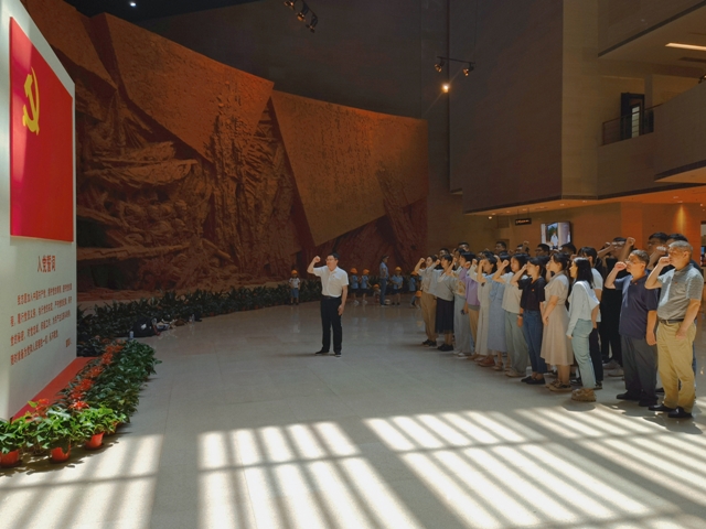 黨員們懷著崇高的敬意,傾聽革命先烈的偉大事跡,瞻仰實物文獻,追憶波瀾壯闊的歷史,感受這場軍民團結一心的偉大勝利和永垂不朽的戰(zhàn)役精神?!岸山瓚?zhàn)役的勝利是靠老百姓用小船劃出來的?!绷暯娇倳浽?020年考察安徽時語重心長地說:“任何時候我們都要不忘初心、牢記使命,都不能忘了人民這個根,永遠做忠誠的人民服務員?!彪S后,安糧實業(yè)的黨員們面向鮮紅的中國共產(chǎn)黨黨旗,高舉右拳,重溫入黨誓詞,鏗鏘有力的誓言回蕩大廳、激蕩人心,將不變的初心與使命鐫刻于心。