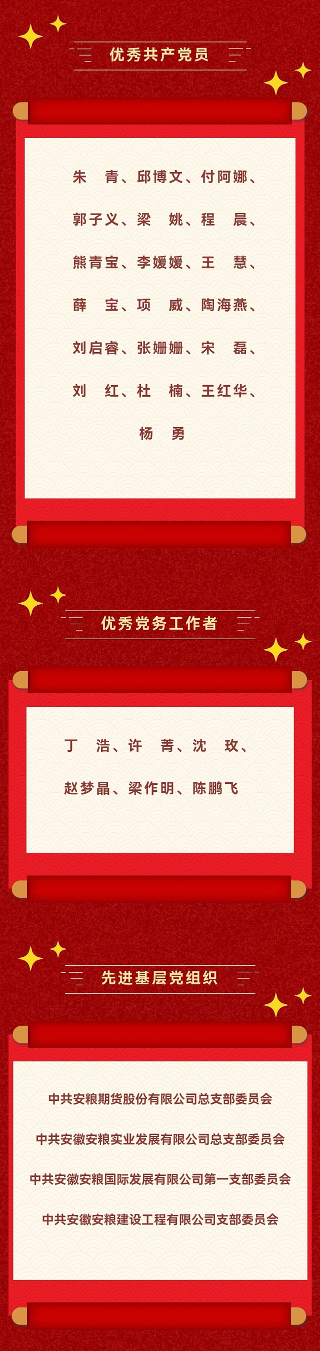 為大力弘揚黨的優(yōu)良傳統(tǒng)和作風,激勵各級黨組織和廣大黨員更加深刻地領悟“兩個確立”的決定性意義,更加自覺增強“四個意識”、堅定“四個自信”、做到“兩個維護”,努力營造見賢思齊、爭做先鋒的良好氛圍。近日,安徽國貿(mào)黨委對優(yōu)秀共產(chǎn)黨員、優(yōu)秀黨務工作者和先進基層黨組織進行了表彰,安糧集團19名優(yōu)秀共產(chǎn)黨員、6名優(yōu)秀黨務工作者和4個先進基層黨組織獲得榮譽。