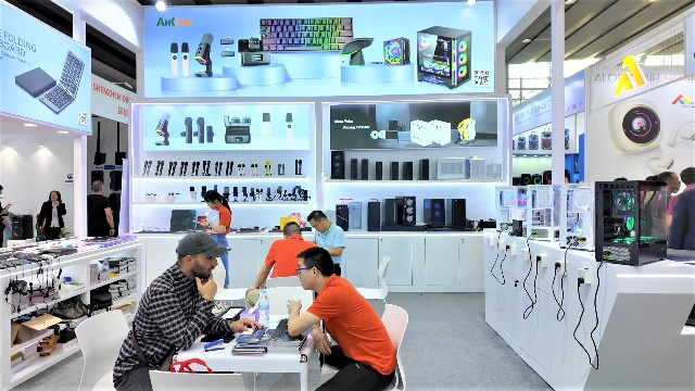 在電子消費品類展區(qū),安糧推出了不同款式的散熱機箱,再加上融入人體工程學設(shè)計的配套鍵鼠,能滿足不同PC DIY的需求。此外,大容量、多接口、充電快的移動電源,也引得不少意向客戶紛紛下訂。
