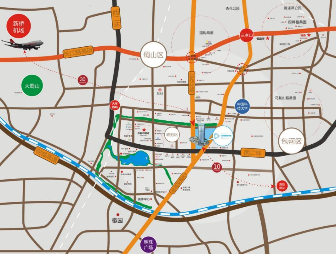 安糧國(guó)貿(mào)中心位于安徽省合肥市蜀山區(qū)金寨南路 811 號(hào)(金寨南路與南二環(huán)交口西北角),為政務(wù)、蜀山與包河三區(qū)交匯的黃金核心,南二環(huán)、金寨路及合作化路三大主干道交匯的稀缺區(qū)位。合肥市政府政務(wù)中心、奧體中心、合肥大劇院等構(gòu)筑起集政務(wù)辦公、文化演藝、體育盛會(huì)、高端商務(wù)于一體的復(fù)合型價(jià)值生態(tài)圈,為項(xiàng)目注入源源不斷的消費(fèi)動(dòng)能與品質(zhì)客群。